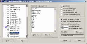 Evidor is a hard drive search tool. Simply select the disk to examine and provide a list of keywords (such as people's names, e-mail addresses, name of traded goods, etc.). Evidor will then retrieve the context of all occurrences of the keywords on the disk. When viewing the output file, you will likely find excerpts from documents that are closely related to the keywords, e.g. purchase orders, e-mail messages, address books, time tables, etc.